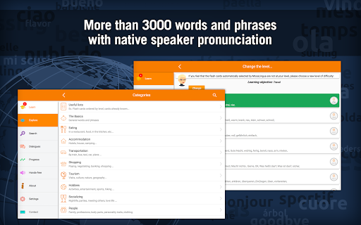 - 3000+ flash cards of vocabulary and phrases, including audio pronunciations by native speakers