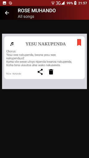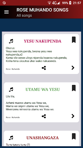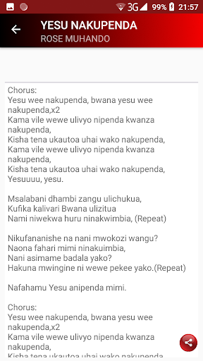 In this app you will find all Rose Muhando Gospel songs lyrics. For example: MUNGU WA MAPENDO NIBEBE NYOTA YA AJABU SITANYAMAZA UTUKUZWE KIATU KIVUE NAKAZA MWENDO MUNGU WANGU NALEGEA NIPISHE NIPITE UNASHANGAZA UTAMU WA YESU YESU NAKUPENDA