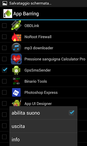 Il menu permette di disattivare temporaneamente l' app selezionando uscita oppure abilitare/disabilitare gli effetti sonori.