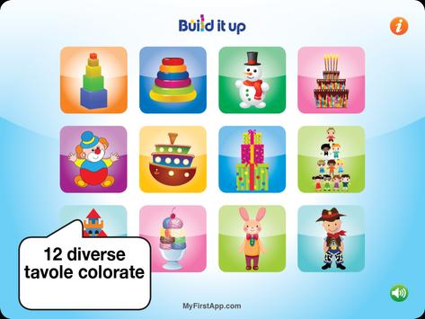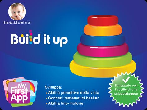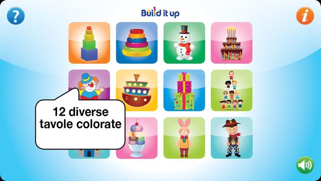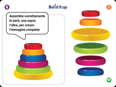 Build it up contribuisce a migliorare le capacità di percezione visiva e le capacità motorie di precisione nei bambini di età superiore ai 30 mesi. Contribuisce anche allo sviluppo dei concetti matematici primari, come quello di dimensioni, di sopra/sotto, di prima/dopo.