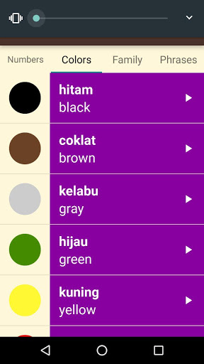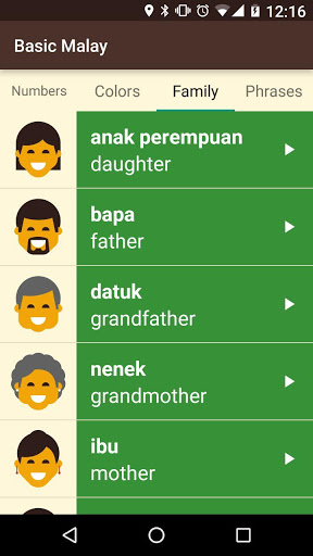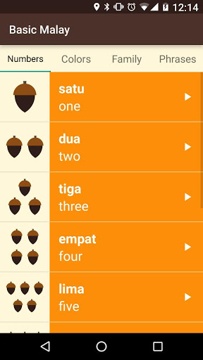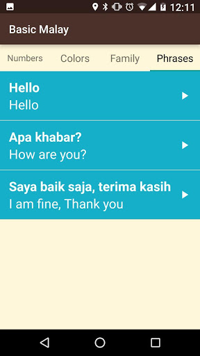 This app helps to learn Malay Numbers, Colors, Family, Phrases and content addition is in process.