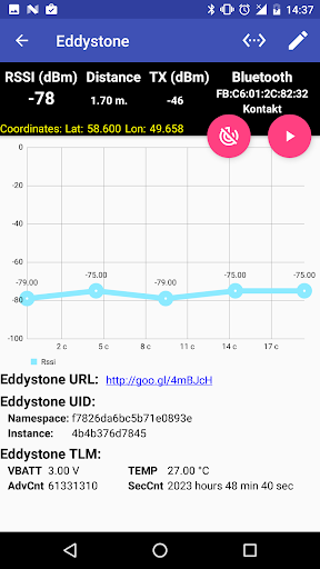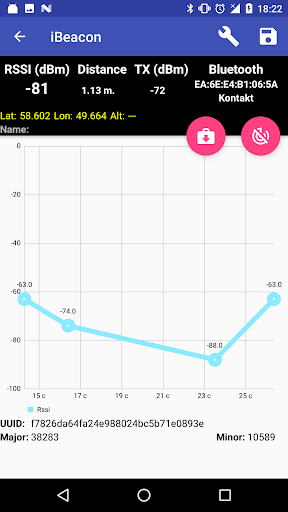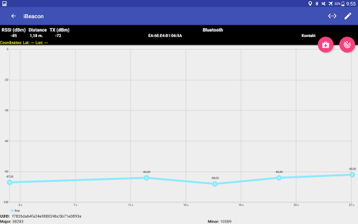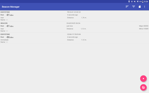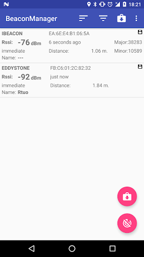 Questa applicazione esegue la scansione e mostra dettagli su IBeaCon e Eddystone (UID, URL, TLM Frames). Un grafico può mostrare gli ultimi valori RSSI. Inoltre, Beacon Manager Application può salvare informazioni con coordinate e commenti GPS corrispondenti.