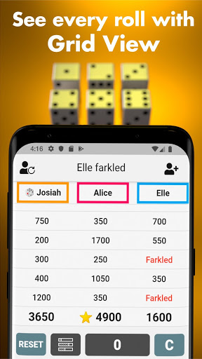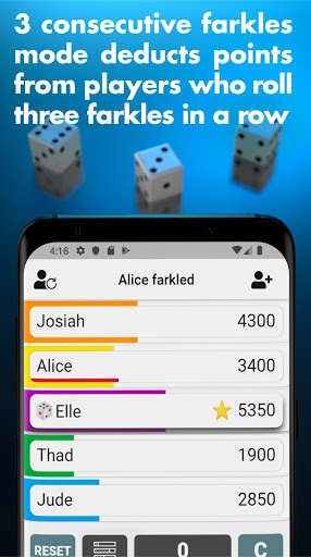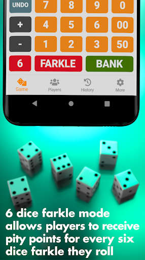 • "3 consecutive farkles" mode - you control the amount of points to deduct from players who roll three farkles in a row. Watch as the heat turns up each time the farkle hits.