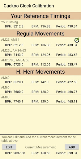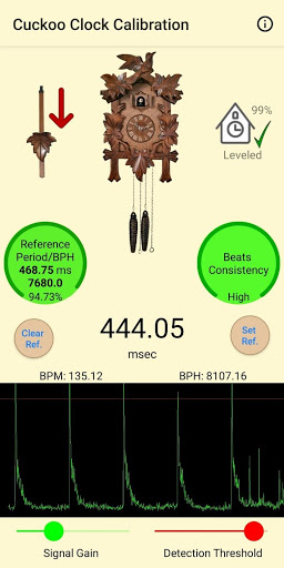 1. Esegui questa app e misura i tuoi tempi dell'orologio a cucù usando il tuo microfono del telefono e 2. Utilizzare il guadagno del segnale e i cursori di soglia di rilevamento per regolare il segnale misurato e il 3. Selezionare un tempo di riferimento per la calibrazione dalla tabella di riferimento dell'orologio
