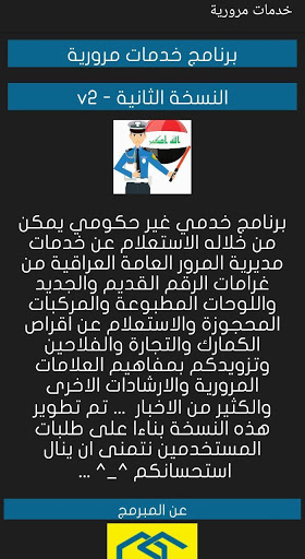 Il programma di servizio non governativo può essere interrogabile dai servizi della direzione del traffico generale iracheno di multe, figura nuova e stampata, veicoli protetti e veicoli riservati e veicoli riservati sulla cincolarità, commercio e agricoltori e forniscono i concetti di traffico e altre orientamenti E molte notizie ... Aggiungi una partizione per notizie esclusive o eventuali nuove spese di notizie Iraqi Street