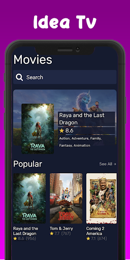 IDEA TV per PC o per un cellulare è un'app che ti consente di scoprire film fantastici, documentari e programmi TV con uno sforzo minimo.Raccomandazioni Thop Thop e app Ricerca per ottenere tutte le informazioni sui tuoi nuovi film preferiti. Puoi anche scoprire quali sono i film più votati per anno o genere o quali sono i film più scaricati oggi con così tanti generi, quando hai bisogno di raccomandazioni cinematografiche oTi stai chiedendo cosa guardare dopo, suggerire film e spettacoli televisivi che è tutto ciò di cui hai bisogno.
