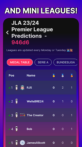 Embark on your journey by creating your character and aim for greatness, striving to secure Gold, Silver, or Bronze medals by finishing in the top 1%, 5%, or 20% of any league, respectively. Become the undisputed League Predictor champion and claim the legendary title!