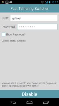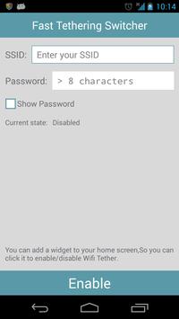 Fast Tethering Switcher is a fast switcher for wifi tethering, it can set your Android phone as a Access Point,so your other device can use the phone's 2g/3g/4g network with Wifi.After setting,you can enable/disable tethering by one click.(Add Widget to Home Screen,click the icon).