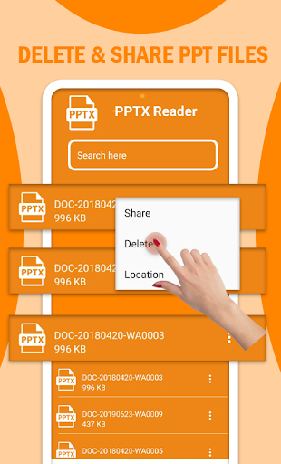 Puoi condividere ed eliminare il tuo desiderato file PPT o PPTX all'istante. Se hai documenti indesiderati o inutili nel tuo dispositivo Android, è possibile eliminarli facilmente utilizzando questo apriscatole di presentazione del lettore PPT. Questo app di modifica PPT: Slids Viewer contiene anche la barra di ricerca per cercare i file del documento PPT istantaneamente nel telefono, se hai molti file PPT nel telefono, puoi facilmente trovarli con la barra di ricerca. Questo reader del file PowerPoint: PPTX Lettore di file può caricare tutti i file PPTX o i documenti PPT nell'app mediante il quale non è necessario trovarli nel telefono, è possibile visualizzare facilmente tutti i file PPT in un unico posto.