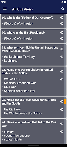 Puoi visualizzare le 100 domande in sequenzialeordine secondo il documento USCIS o in ordine casuale.