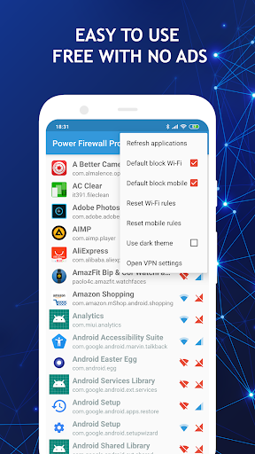 Power Firewall Pro fornisce un modo semplice e semplice per controllare l'accesso a Internet.Puoi consentire o deniga app per accedere alla connessione Wi-Fi oa connessione mobile.