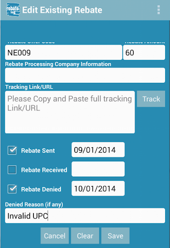 You can easily mark rebates as pending, received or denied on add/edit page.