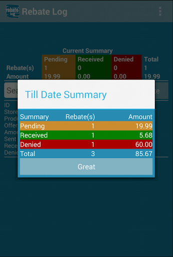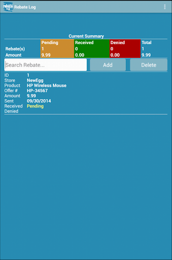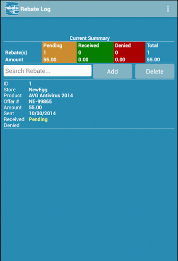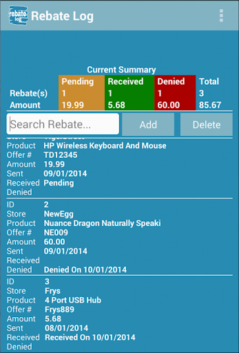 With our simple Rebate Log app, you will love to manage your rebates. Rebate Log can help you organize your pending, received and denied rebates easily. Add, edit, search and delete rebates at Rebate Log app will be very convenient.