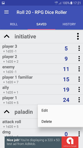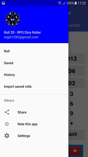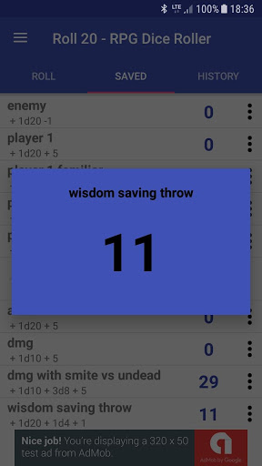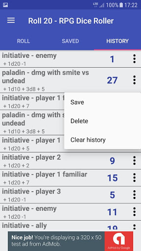-It saves up to 100 last rolls which you can search through and delete at any time, tap them to reroll