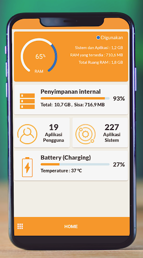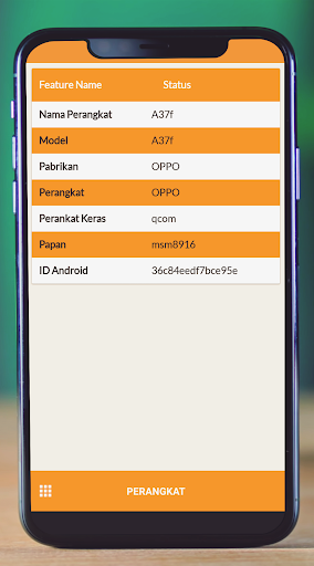 Aplikasi Info Perangkat handphone mencakup informasi tentang CPU, RAM, OS, Sensor, Penyimpanan, Baterai, SIM, Bluetooth, Aplikasi Terinstal, Aplikasi Sistem, Layar, Kamera, dll.