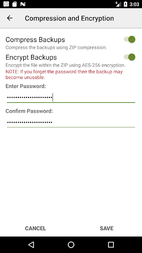 - Backup viene creato localmente sul telefono per impostazione predefinita, ma ha opzioni per Carica su Google Drive, Dropbox, Onedrive o e-mail. In nessun momento i file vengono inviati allo sviluppatore.