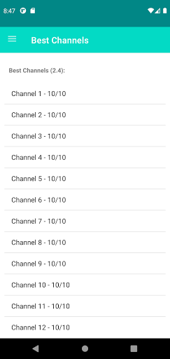 La nostra app ha anche un sistema differenziato che ti aiuta a scegliere il miglior canale per la tua rete 2.4. Per questo, scansiona tutte le reti vicine, controllare i canali, il campo di interferenza di quella rete nei canali vicini e la forza del segnale per segnare i migliori canali per te. Questi valori vanno da 0 (canale sovraccaricato) a 10 (canale gratuito).