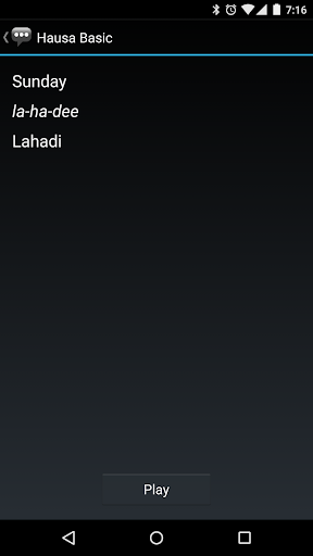 3. Sulla pagina di dettaglio frase, la frase Hausa è mostrato a fianco la pronuncia e l'equivalente frase inglese. Premere il pulsante Play per ascoltare la pronuncia audio da un madrelingua.