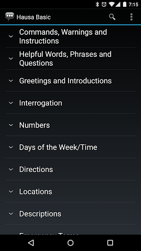 Utilizzando questa applicazione, è possibile selezionare una frase inglese e visualizzare la sua traduzione e come si pronuncia in Hausa.