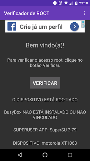 Este aplicativo é um aplicativo simples que verifica se o seu dispositivo Android tem acesso de super usuário ("root") ou não. Basta clicar sobre o botão de verificar,os usuários podem verificar se o seu dispositivo Android está devidamente enraizado ou não. Além disso,os usuários podem verificar se eles têm busybox instalado em seu dispositivo Android , juntamente com a versão do busybox XDA