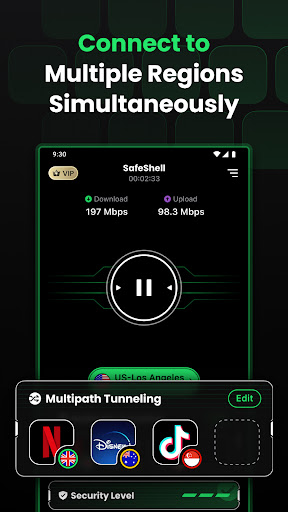 L'esclusiva tecnologia brevettata di SafeShell consente connessioni simultanee a più regioni, navigando senza sforzo nel panorama online globale.