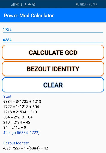 - GCD: Step by step using the Euclidean Algorithm and the possibility to express it with Bezout Identity.
