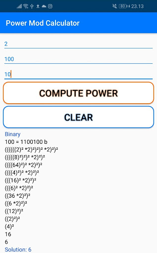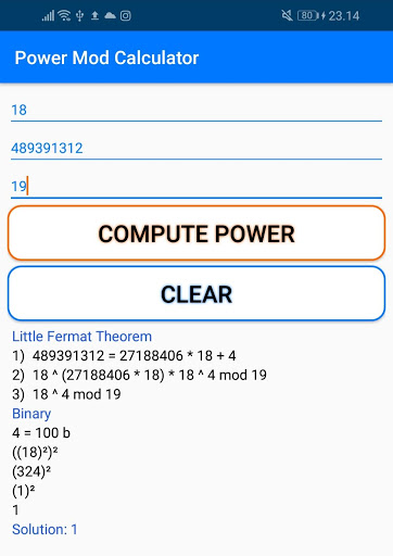 - Power Mod: Compute the solution to aᵇ mod n, step by step. Using Little Fermat Theorem or Binary when it's necessary.