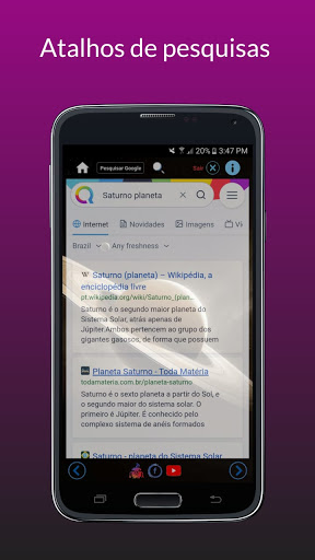 Saturn Browser contém opção de fazer downloads, contém atalhos de navegação, ideal pra fazer leitura e pesquisas rápidas e não contém anúncios