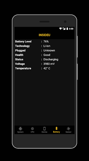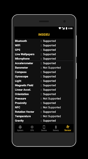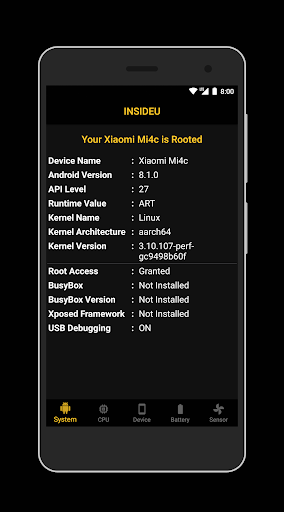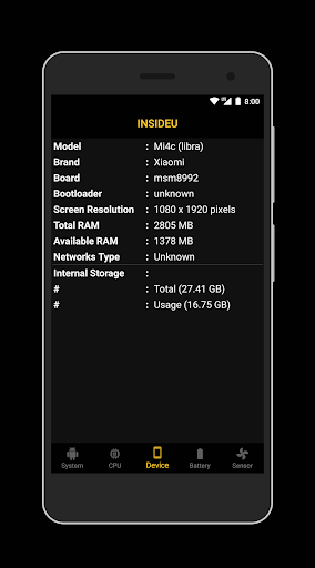 INSIDEU shows information about device like processor, cores, speed, model, ram, sensors etc. Not like other CPU Info apps, INSIDEU also can check ROOT ACCESS.