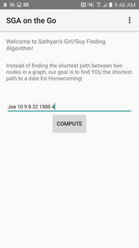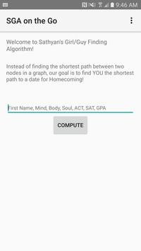 Sathyan Girl/Guy-finding Algorithm (SGA) is a project inspired by the complications high school students face during Homecoming, Prom, and other events. It might be your first dance, and you really want to ask someone to it, but alas! Who to ask? Perhaps you have a general idea of 4 or 5 potential candidates, but there's no way you can decide between them! The answer to all your matchmaking woes lies in SGA.