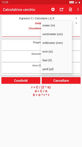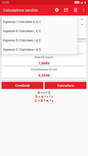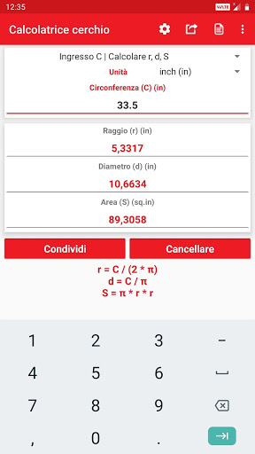 Valori e risultati calcolati possono essere condivisi con social media, posta, messaggi e altre app di condivisione.