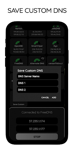 L'applicazione ha un grande elenco dei server DNS più famosi, è anche possibile aggiungere e salvare il server DNS.