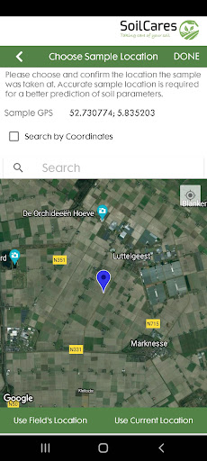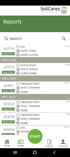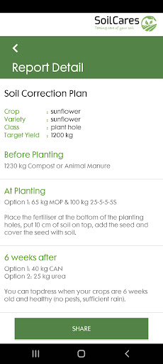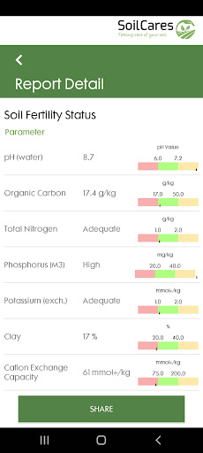 L'applicazione collega VIE Bluetooth con lo scanner Agrocares, a seconda della chiave di licenza che gli utenti possono analizzare con lo stesso terreno del dispositivo, feed o materiale foglia e creare rapporti sullo stato dei nutrienti.