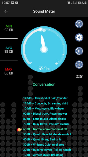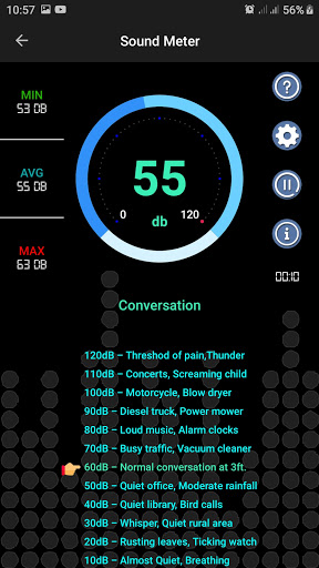 - Il livello di pressione sonoro utilizza il microfono del telefono Per misurare suoni troppo rumorosi. I microfoni nella maggior parte dei dispositivi Android sono allineati alla voce umana. I suoni molto forti (oltre 90 dB) potrebbero non essere riconosciuti nella maggior parte dei dispositivi. Quindi per favore usalo come solo uno strumento ausiliario. A volte il valore del DB calcolato mediante il misuratore del livello di pressione non è esattamente come un misuratore di livello di pressione effettivo, e ciò è dovuto a alcuni dispositivi Smart Phone Microfono sono allineati alla voce umana.