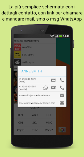 Trovato il contatto che cercavi, la schermata di dettagli ti permette di chiamarlo o di mandare una mail, sms o messaggio Whatsapp con un solo tap.