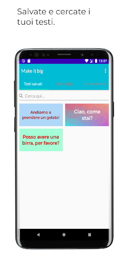 Make it big - Testo grande sul display è una grande applicazione gratuita per comunicare con altre persone in tempi in cui non è possibile esprimersi parlando. Con Make it big - Testo grande sul display puoi mostrare un testo grande sul tuo smartphone che si ridimensionerà automaticamente in base alla quantità di testo immesso. Make it big - Testo grande sul display è stato sviluppato appositamente per mostrare alle persone che hanno difficoltà a sentire ciò che l'utente dice. Sia dall'altra parte della stanza o fianco a fianco, Make it big - Testo grande sul display può aiutare a mostrare ciò che avete da dire.