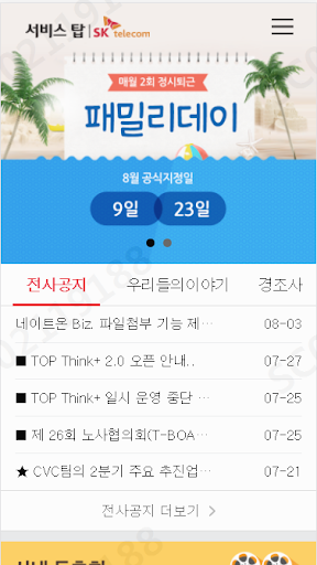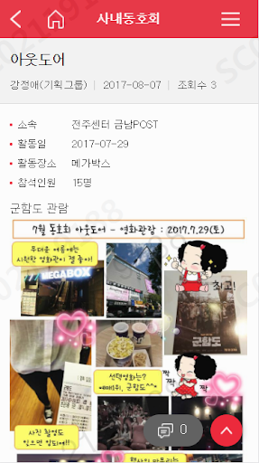 전사공지, 우리들의이야기, 경조사 의 소식을 모바일로 확인할 수 있다. 사내 동호회 활동을 업로드하여 동호회 지원비를 받을 수 있다. ---- 개발자 연락처 : 010-9384-7722