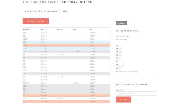 Late for the Bus is an app designed for Palmerston North Massey University students to make it easier to determine which bus is next available. This app creates a comprehensive Palmerston North Horizons bus timetable that can be used easily on all devices.