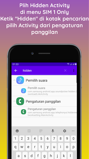 - Seleziona solo SIM 1 - Attività nascosta - Tipo "HiddenNetwork" nella casella di ricerca. Apparirà l'applicazione delle impostazioni di chiamata. Nell'attività rete nascosta toccare il vecchio tocco più opzioni di menu appaiono: