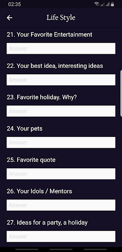 Un fantastico mondo di domande che ti porteranno in un viaggio emozionante attraverso la tua vita. Categorie uniche con domande e digest ti daranno nuove emozioni.