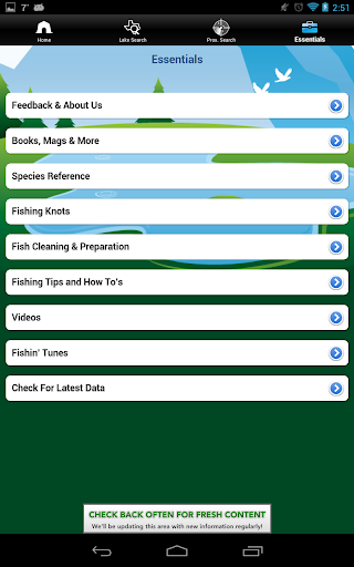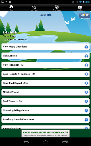 Ora puoi accedere facilmente informazioni dettagliate su oltre 7.900 laghi d'acqua dolce, stagni e serbatoi in tutto il Texas. Ottieni rapporti sul lago in tempo reale, condizioni meteorologiche e miglior orari di pesca. Rivedi e contrassegna i tuoi hotspot preferiti e imparare suggerimenti, trucchi e tecniche.