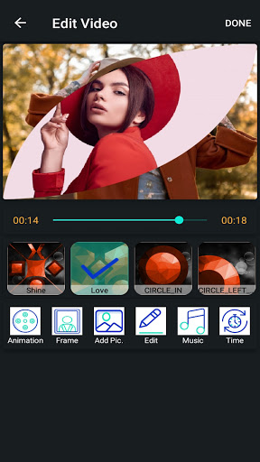 Questo app con effetti di transizione per uno slideshow creativo. Gli effetti di transizione creano fantastiche animazioni tra 2 immagini. Foto slideshow e film saranno più belli con effetti e cornici.