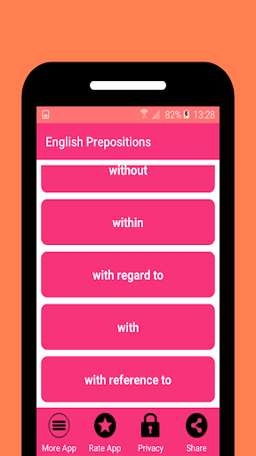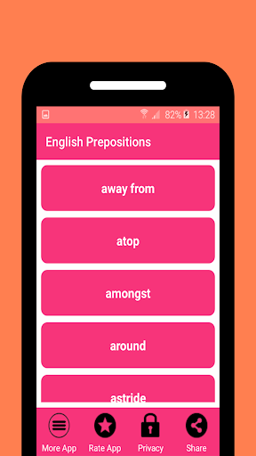 L'applicazione Inglese Preposition include tutta la preposizione in inglese con esempi e significato da AZ per imparare tutte le regole della grammatica inglese perché molti principianti e studente in lingua inglese trovano alcune difficoltà per capire la preposizione dell'inglese con questa app in preposizione e comprenderà molto facilmente.