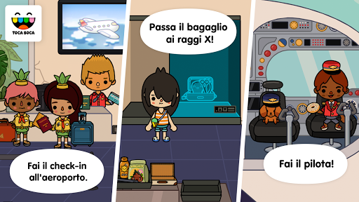Con quattro ambientazioni da esplorare in Toca Life: Vacation, non finirai mai le idee per le tue storie. Vuoi iniziare la tua avventura all'aeroporto? Divertiti con la macchina a raggi X, imbarcati sull'aereo e visita la cabina di pilotaggio. Poi mangia uno snack e goditi il volo! Alla tua destinazione, potrai scegliere tra moltissime attività: fare shopping e visitare il pontile, giocare sulla spiaggia e fare surf sull'oceano ed esplorare l'hotel.
