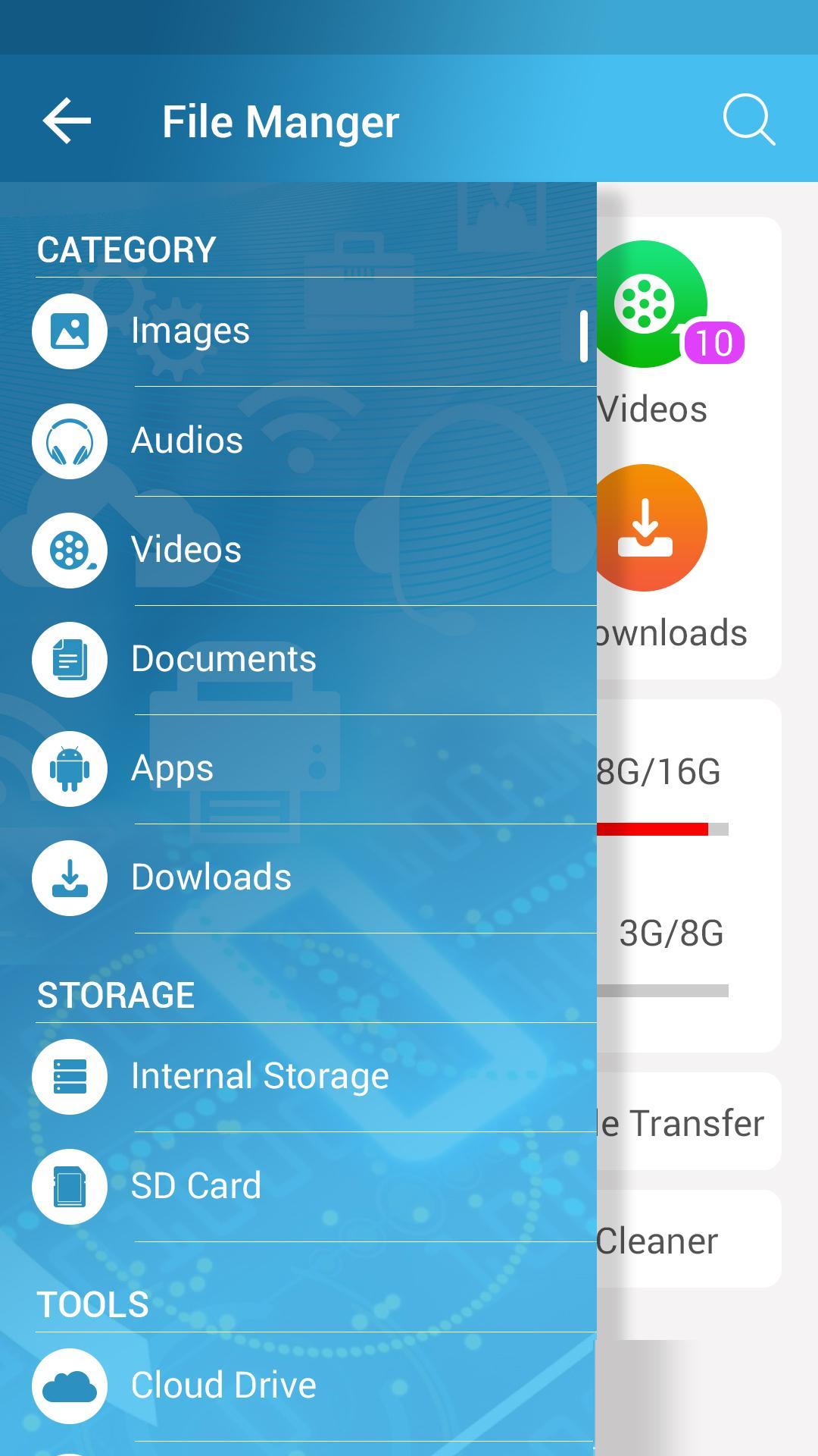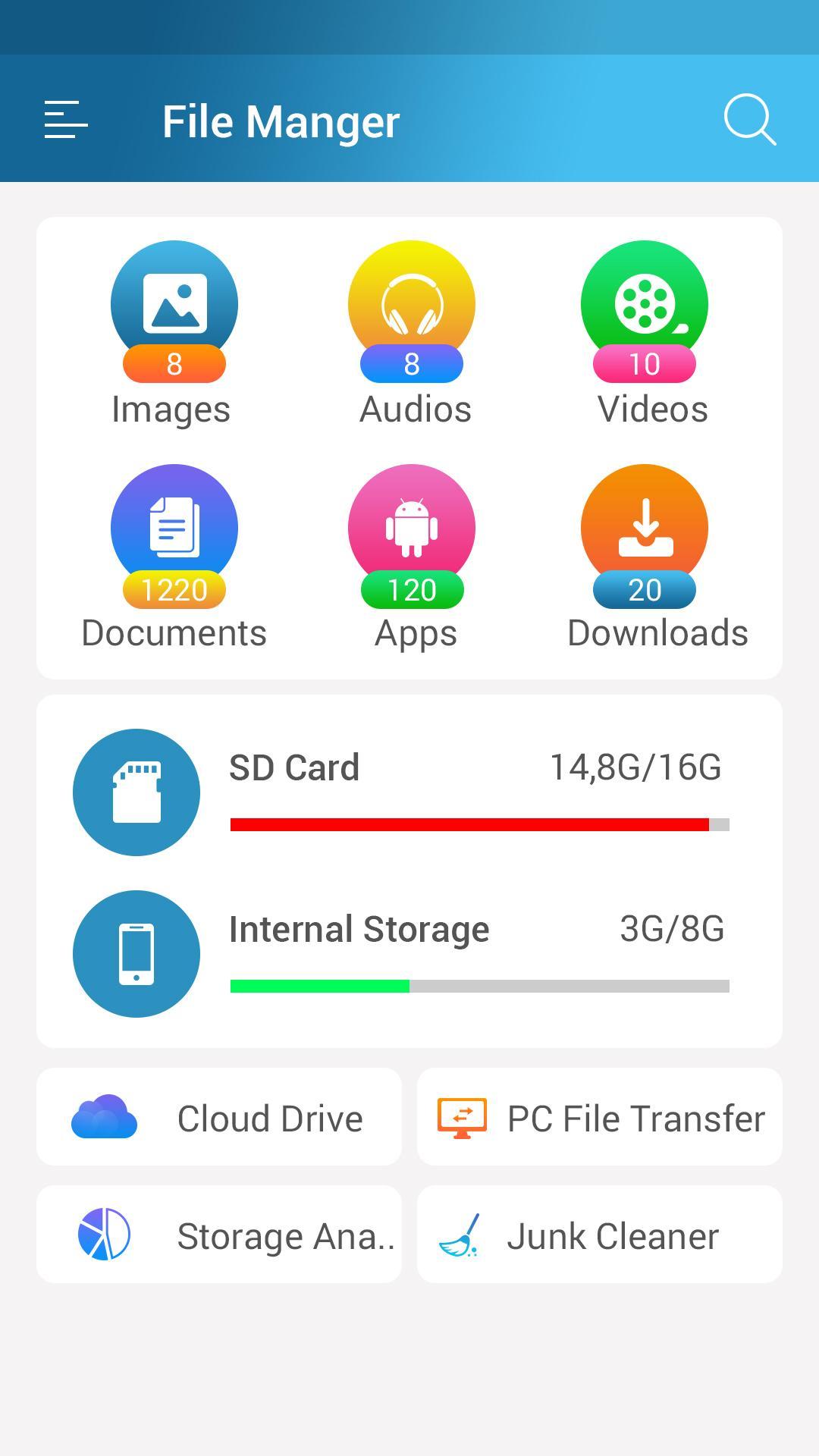 File manager app is free, really easy to use with file organizer by category: Images, Music, Movies, Documents, Apps,...