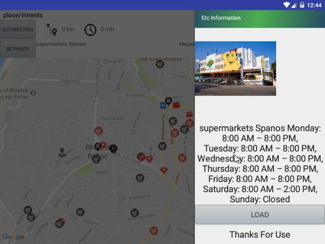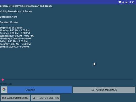 afterward route will become more distant. Of course the user can have a choice to select from Algorithm or from his map and continue with his meeting. If his current liabilities allow user can close the meeting, this happen if he have not a meeting at same time or the shop is open. At the final activity user have possibility to set route by the layout of meetings or set an alarm. To accomplish this I used tools like: Android Studio, JAVA, Google Api android, PHP, sql (online database),sqlite, joda timer,Adode Photoshop, Adode After effects.