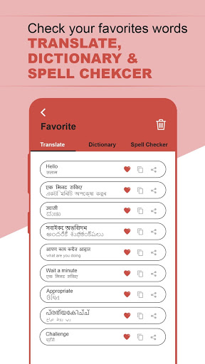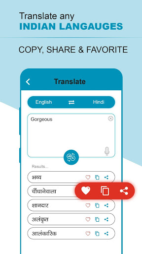This app supports both way translation for e.g.: Hindi to English or English to Hindi Translation, Likewise Telugu to English, English to Telugu, Bengali to English to English to Bengali, so as to many Indian languages.