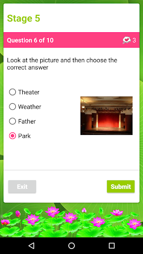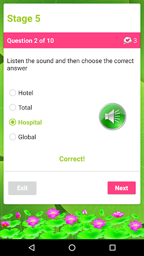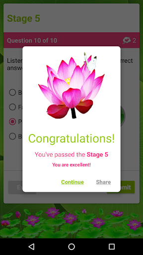 The game is very simple. You just need to pass all stages. Each stage has ten multiple-choice questions which covering both listening and viewing. At the start of each stage, you will be provided three hearts. With a wrong choice, you will be subtracted one heart. When you pass a stage, you will be able to choose a next stage.