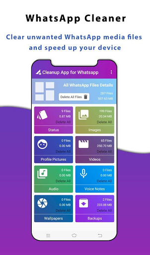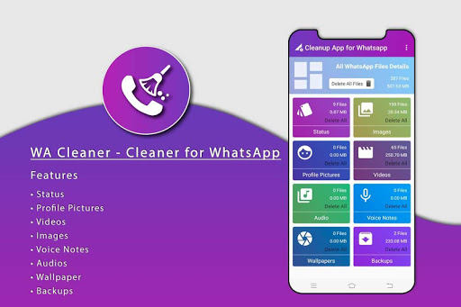 Pulitore per Whatsapp è uno strumento stupendo che aiuta gli utenti a gestire il contenuto di whatsapp come lo stato, immagini del profilo, video, immagini, note voci, audio, carta da parati , Backup ...
