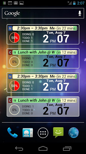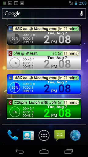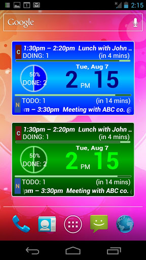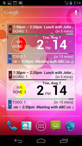Be smart with clock Agenda WidgetSU Agenda Clock provides you with the unique widgets to show clock and your schedule together.1. Clock Agenda You can check the current time and the schedule at a glance. You can know the the remaining time of your ongoing schedules andupcoming schedules.2. Agenda Status It shows the brief statistics of your today schedules with graphics. You can check the remaining time of the current schedule. You can check the remaining time until the next schedule.3. Customizable Themes You can choose one among the various themes. You can customize its looks including color, information column, clock format and so on.4. Easy Configuration and Convenient Link You can easily change its configuration by touching a clock. You can see the details of a schedule by touching. You can see the agenda list by touching the schedule statistics. Edition Guide SU Agenda Clock Lite edition is based on SU Point System in which you need to look advertisements. SU Agenda Clock Lite Pro edition is a paid edition withoutadvertisements. Installation Guide Some features depends on your phone features and OS version. Google calendar should have been installed on your phone. We recommend that you test a SU Agenda Clock Lite edition before you buy a SU Agenda Clock Lite Pro edition.Keywords : widget, clock, watch, agenda, schedule, calendar